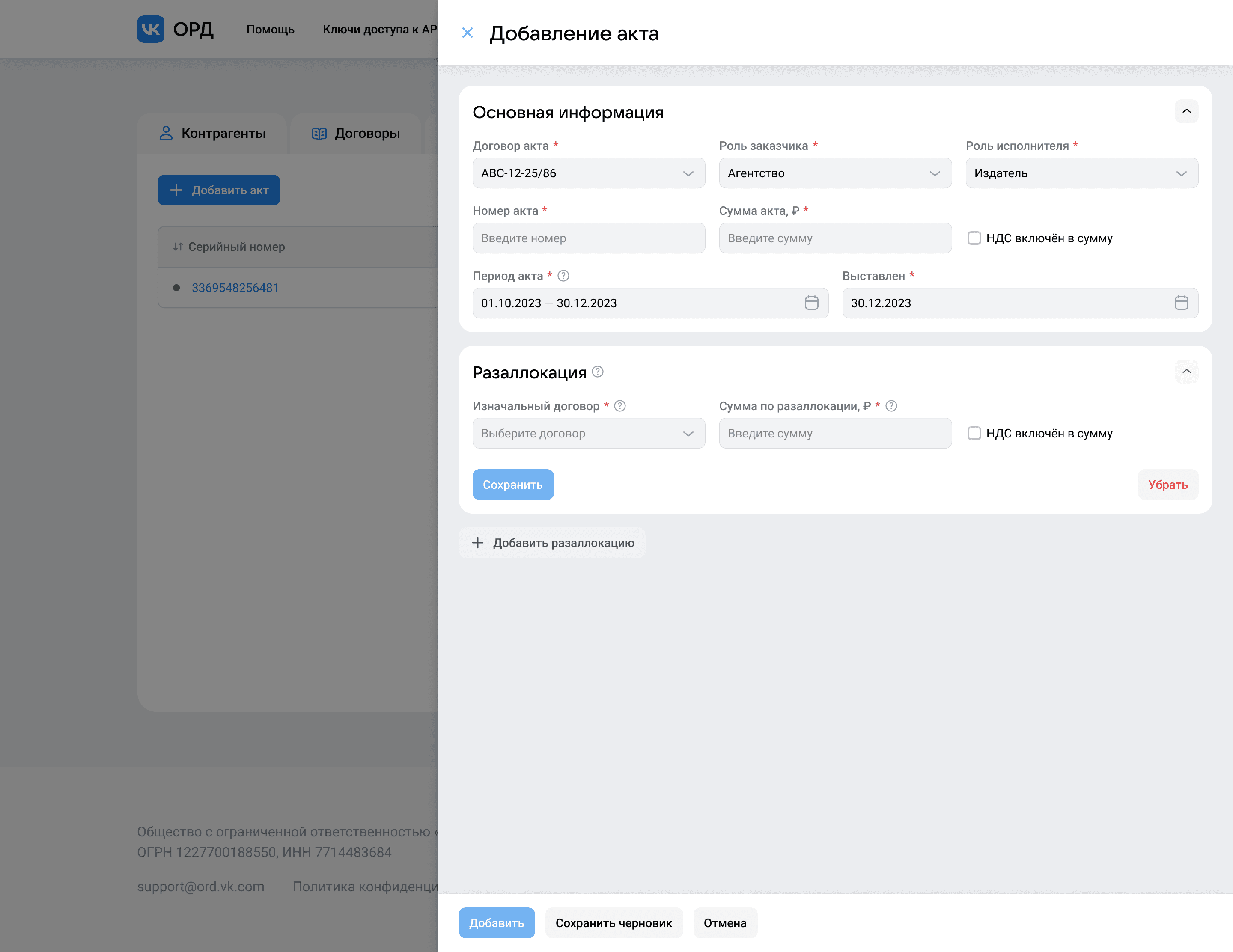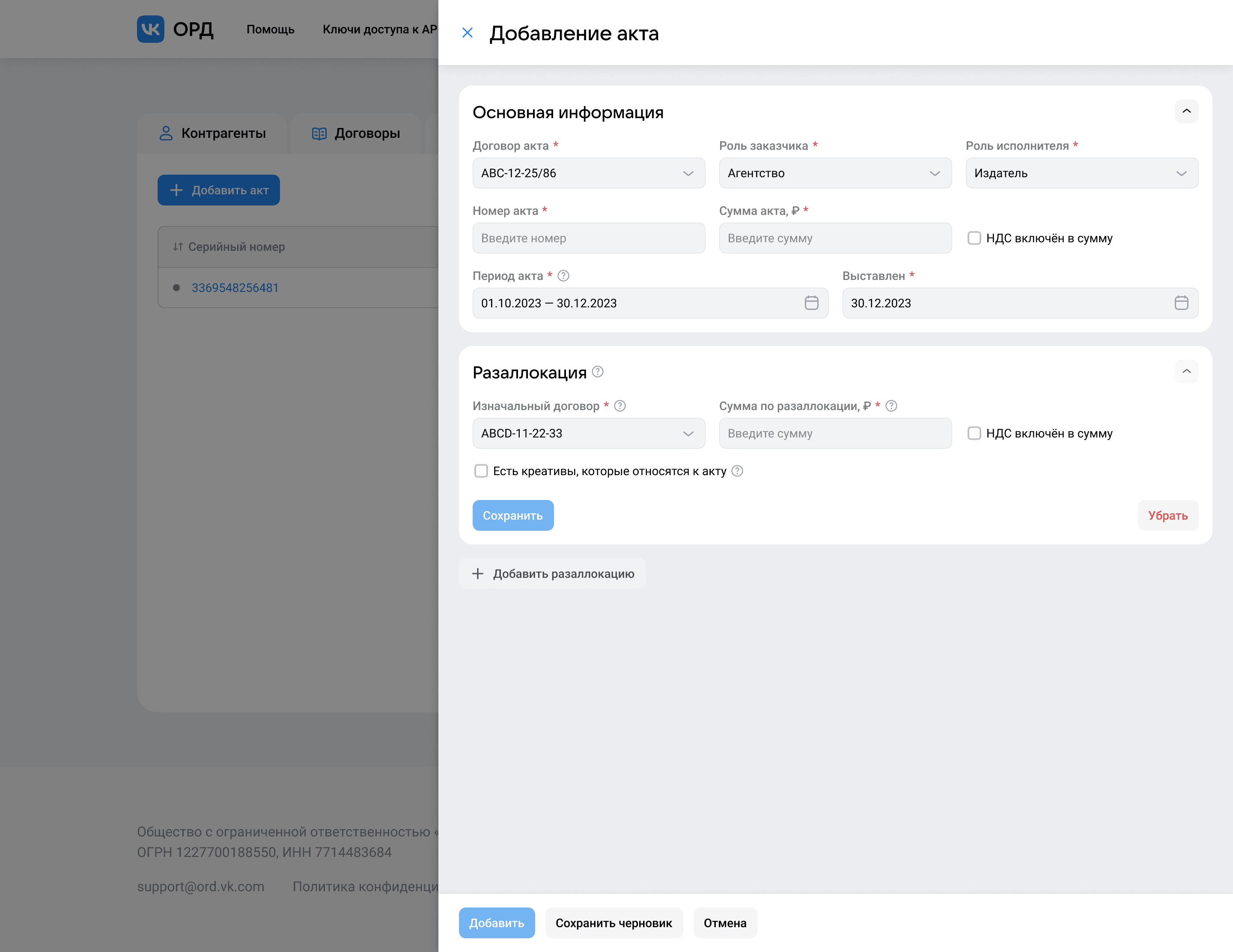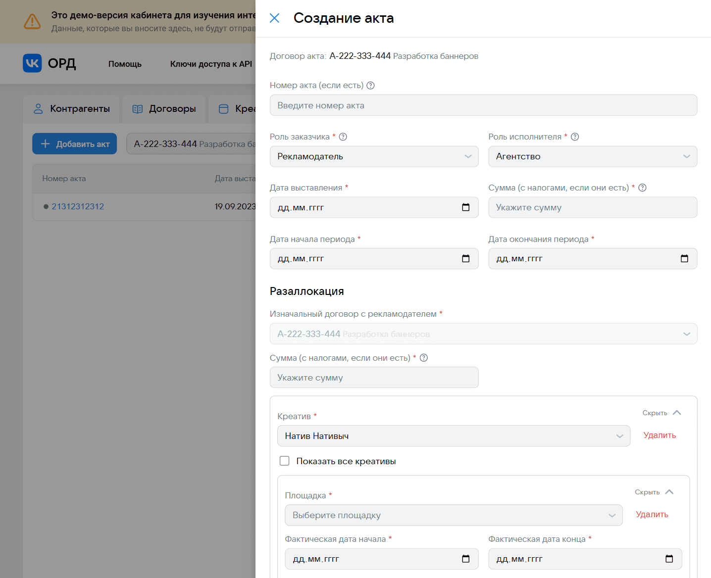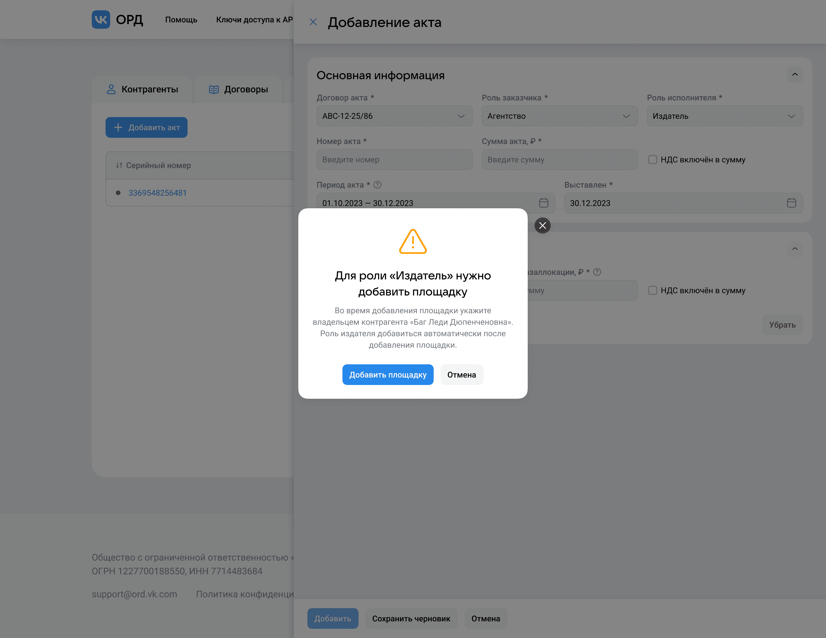 Бывают кейсы, когда в рамках акта нужно указать исполнителя издателем, но чаще всего такую роль контрагенту даже не заводят. Особенность этой роли в том, что для её добавления контрагенту нужно указать площадку, издателем которой является контрагент. Форма предусматривает этот кейс и выводит подсказку о добавлении площадки, а мультимодальность позволит решить этот кейс не покидая форму акта.