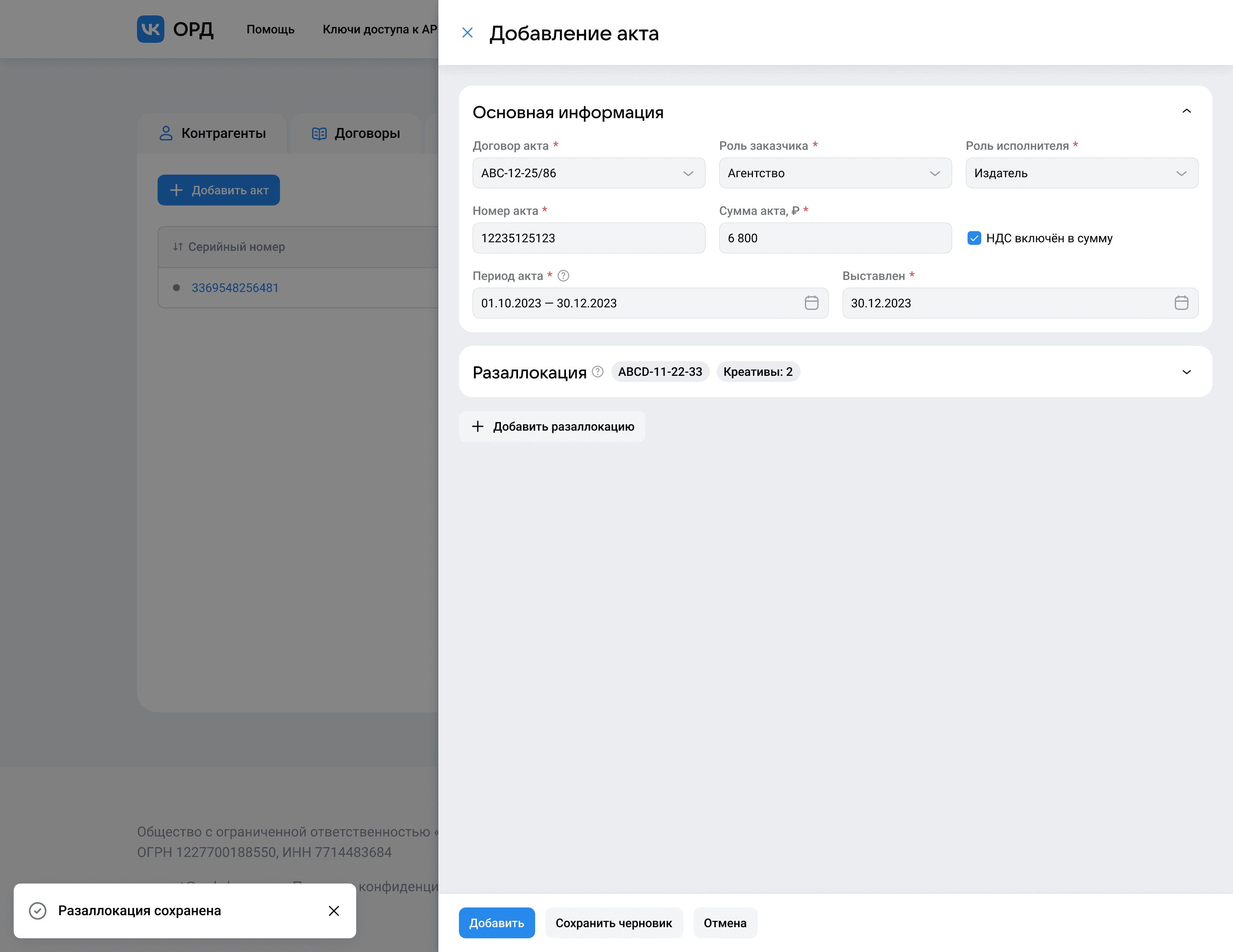 Большие акты иногда требуют несколько разаллокаций, специально для таких кейсов был предусмотрен свёрнутый вид разаллокации, который отображает номер договора, к которому она относится и указанное количество креативов. Такое решение позволяет сделать форму легче и снижает когнитивную нагрузку во время её заполнения.