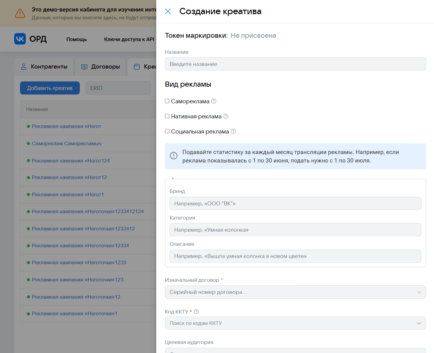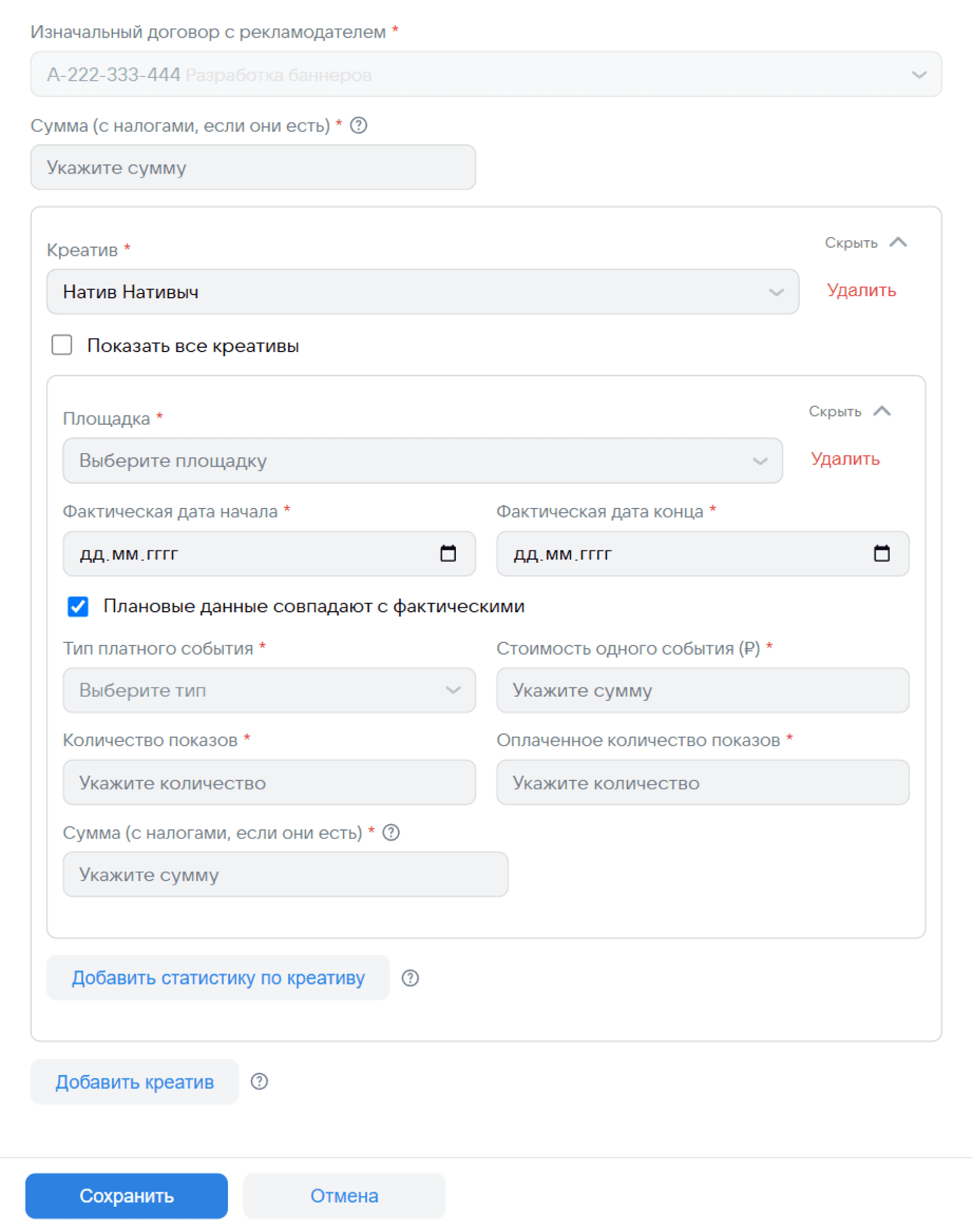 На договор может быть оформлено множество креативов, но благодаря пошаговому заполнению нужных полей, форма умеет анализировать данные и выводить только релевантные для конкретного периода и договора креативы, не отображая лишнего