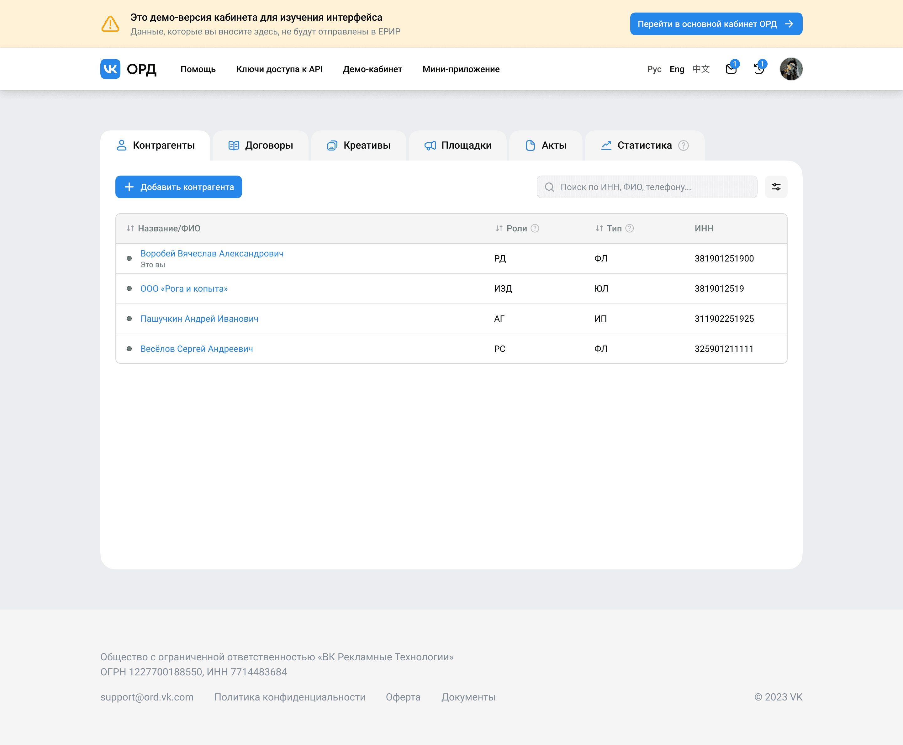 В ОРД есть демо-версия кабинета, где можно тестировать интерфейс, пробовать заполнять формы и так далее. Однако до моего прихода демо-кабинет отличался от настоящего только ссылкой, это вызывало ошибочную подачу данных в демо-кабинет, вместо настоящего.
