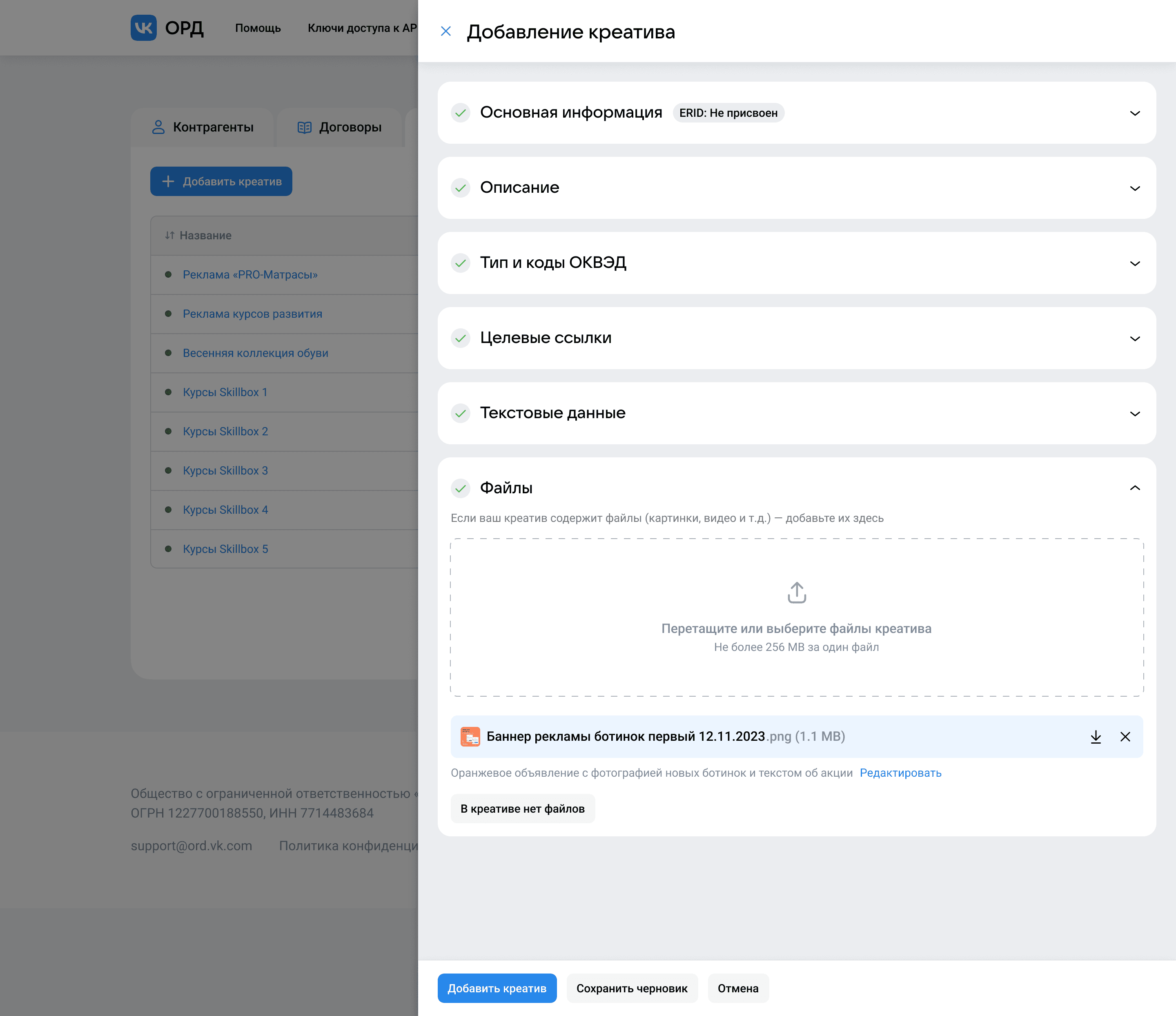 Форма регистрации креатива после обновления