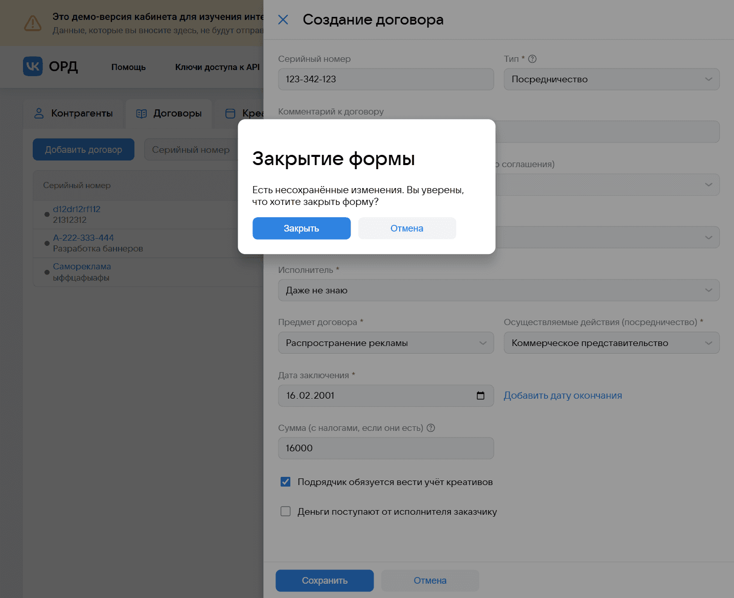 Обновлённая форма контрагента, открытая поверх формы добавления договора