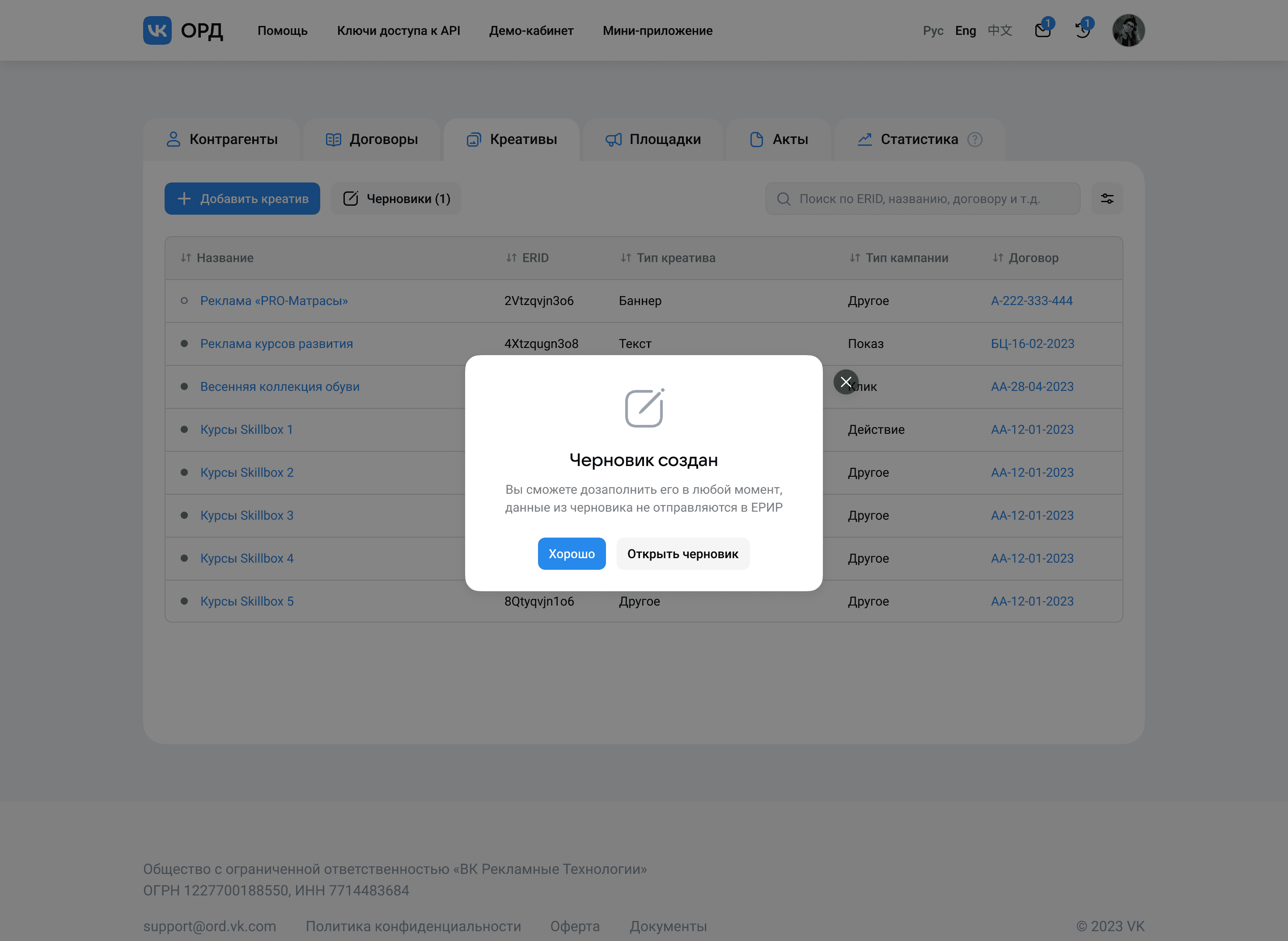 Идентификатор рекламного креатива, он же ERID, является ключевым для поиска нужных креативов, поэтому было принято решение дать ему больше акцента и сразу показать, где его можно будет увидеть. Пока креатив только регистрируется, в форме указывается, что ERID ещё не присвоен — он отобразится там как только ЕРИР одобрит данные