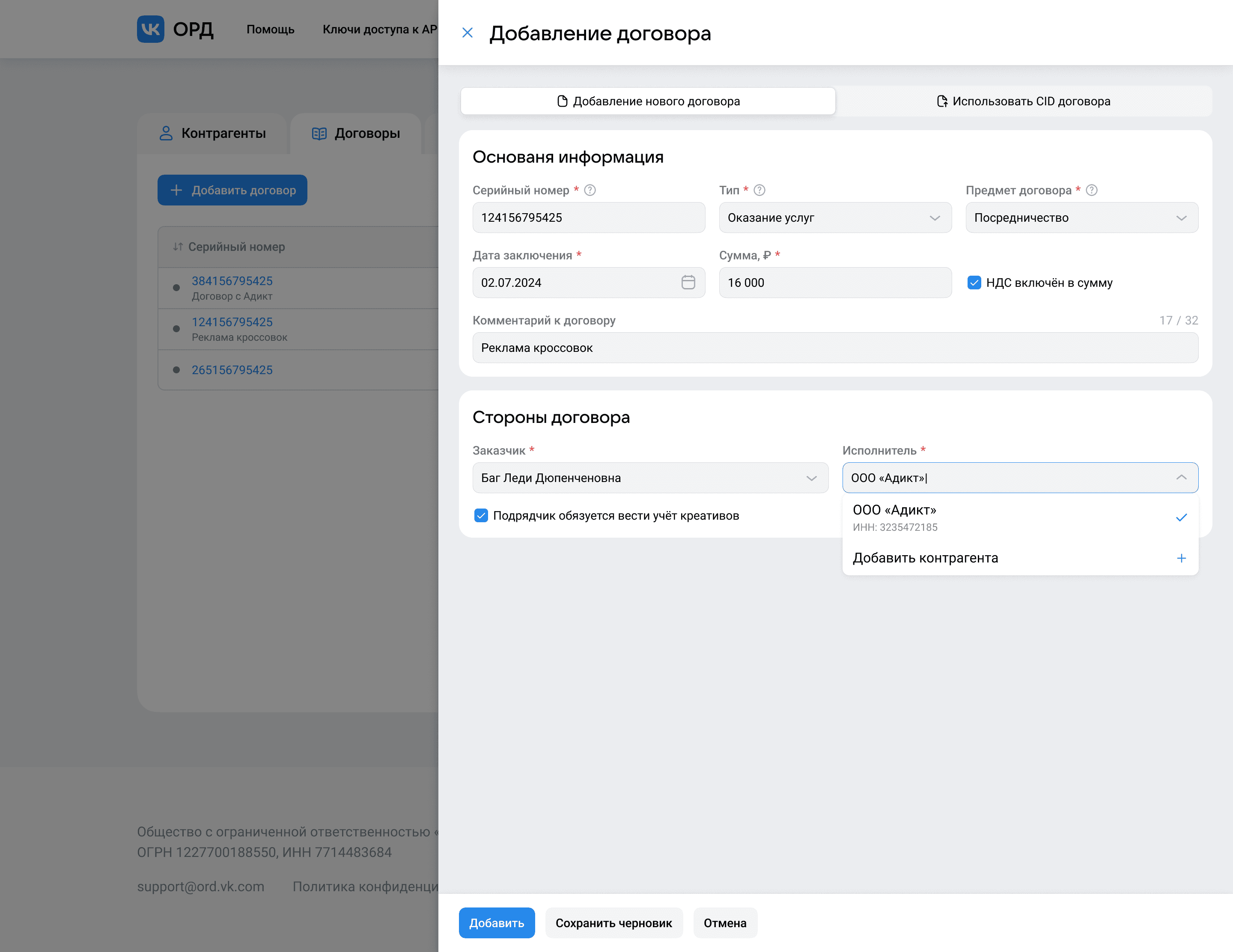 Обновлённая форма договора с раскрытым инпутом поля исполнителя, где можно не только выбрать уже имеющихся, но и добавить нового